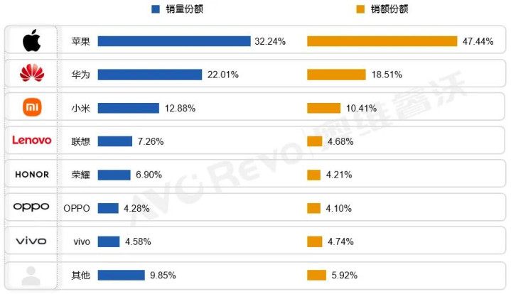 苹果以32.24%销量份额和47.44%销额份额稳居双榜第一